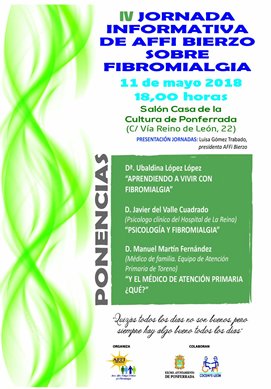 La asociación AFFI Bierzo les invita a la «IV Jornada Informativa sobre Fibromialgia» que se celebrará el viernes 11 de mayo a las 18:00 h. en la Casa de la Cultura de Ponferrada con el siguiente programa: