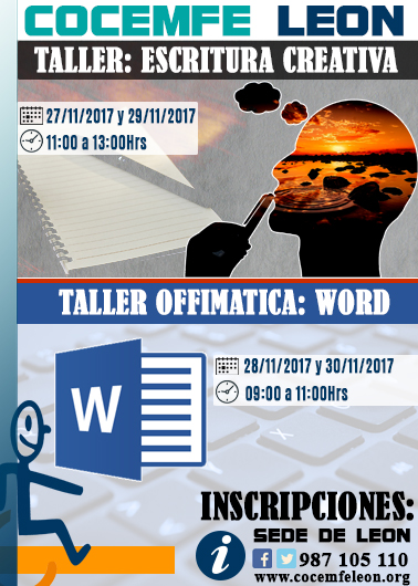 • Taller de ESCRITURA CREATIVA: El taller será los días 27 y 29 de Noviembre en horario de 11:00 a 13:00 horas en la sede de COCEMFE LEON (C/ Descalzos 10, Bajo).