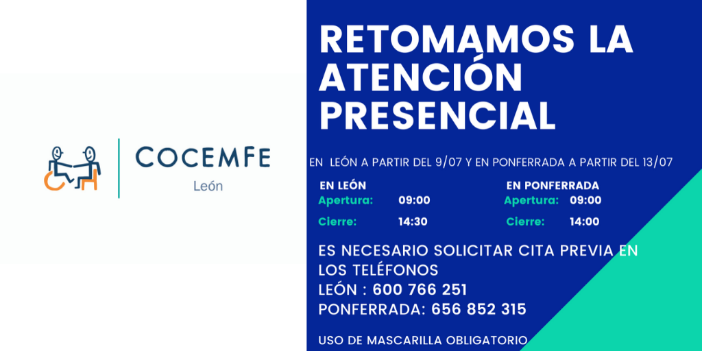 COCEMFE LEÓN vuelve a prestar los servicios de forma presencial. No te olvides de llamar antes para pedir cita. Recuerda que el aforo a nuestras instalaciones es limitado, has de ser puntual a nuestras citas y el uso de mascarilla es obligatorio.